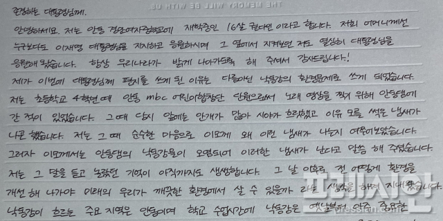 경북 안동 경안여자중학교 3학년 권다인 양(16)은 낙동강 오염 문제를 걱정하는 진심 어린 손편지를 이재명 대통령에게 전달하기 위해 17일 어머니 권해숙(54) 씨와 함께 대통령실을 찾았다.