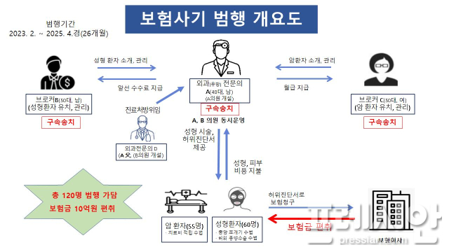 이들은 2023년 2월부터 올해 4월까지 약 26개월간 허위 유방종양 진단서와 가짜 수술기록을 꾸며 보험사로부터 약 10억원의 보험금을 받아낸 혐의를 받고 있다.