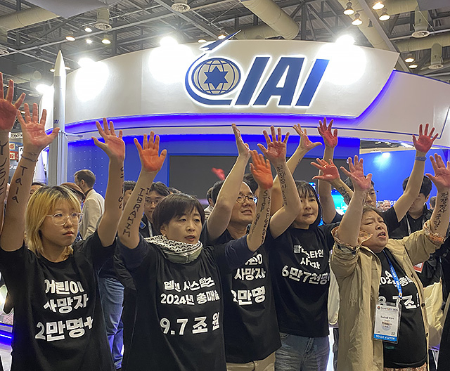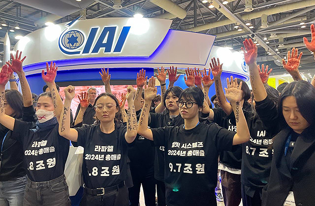 이스라엘의 전쟁 무기를 공급하는 기업들이 한국에서 열리는 항공우주 및 방위산업 전시회에 참가한 가운데, 집단학살과 전쟁 장사를 중단하라는 항의시위가 전시회 현장에서 펼쳐졌다.