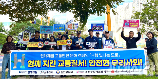 현대제철 순천공장은 22일 '제2차 H형 빛나는 도로' 사업의 일환으로 순천승평중학교와 신대초등학교 앞에서 '교통안전 문화 확산 캠페인'을 실시했다.