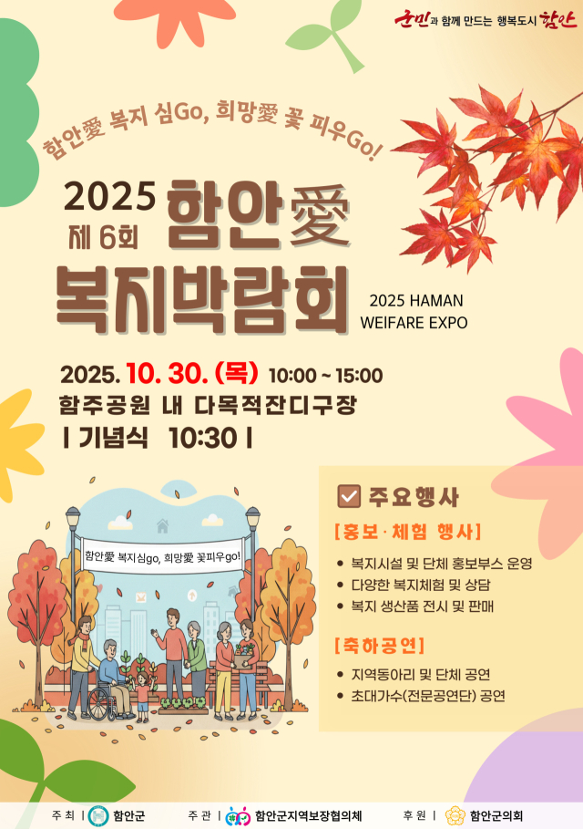 함안군과 함안군지역사회보장협의체는 오는 30일 오전 10시 함주공원 다목적잔디구장에서 '제6회 함안애(愛) 복지박람회'를 개최한다고 밝혔다.