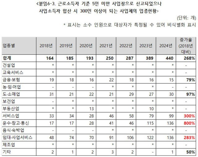한편 더불어민주당 김주영 의원실이 국세청 자료를 받아 분석한 바에 따르면, 가짜 5인 미만 의심 사업장은 2018년 6만 5892개에서 지난해 14만 382개로 2배 이상 늘었다.