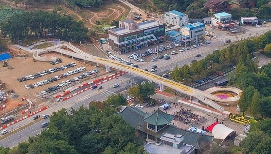 우선 보행교는 도로에서 5m 위로 조급하지 않고 여유 있게 떨어져 있다. 안전성과 쾌적함을 더하기 위해 법정 최소기준인 4.5m를 0.5m 넘긴 높이로 설치한 것이다.