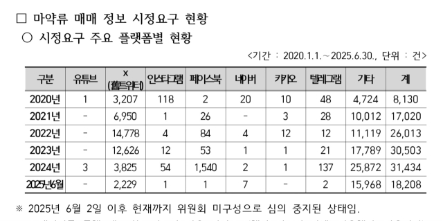 X(옛 트위터), 페이스북, 텔레그램 등 온라인 플랫폼을 중심으로 마약류 매매 정보가 확산되고 있지만, 방송미디어통신심의위원회(방미심위)의 대응이 여전히 ‘신고 의존형’에 머물러 있다는 지적이 제기됐다.