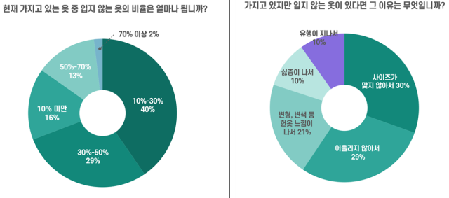 조사에 따르면 응답자의 절반 이상이 입지 않는 옷을 헌옷수거함에 버리며 28%는 사용하지 않아도 계속 소유하고 있었다.