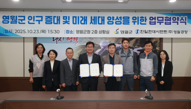 영월군(군수 최명서)은 23일 한일현대시멘트(주) 영월공장(공장장 허권회)과 인구 증대 및 미래 세대 양성을 위한 업무 협약을 체결했다고 밝혔다.
