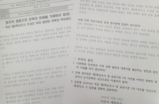 익산시 애향본부는 "지금 즉시 불필요한 정치적 혼선을 중단하지 않는다면 모든 수단과 방법을 동원해 강력히 대응할 것"이라며 "이원택·안호영 의원은 지역 균형 발전의 대원칙을 훼손하는 망언과 정치적 거래를 즉각 중단하라"고 주장했다.