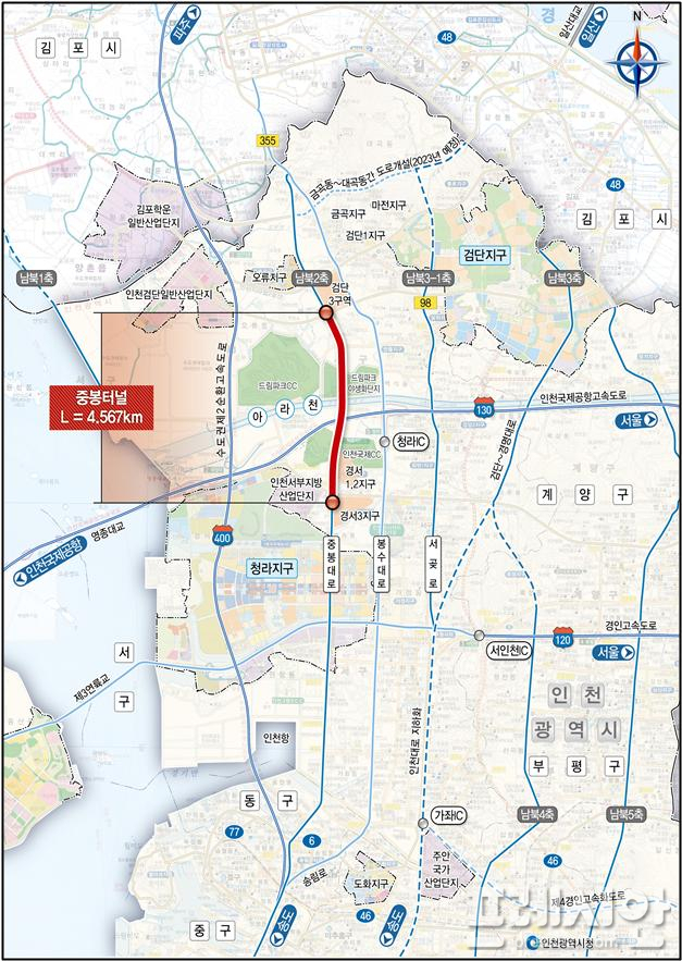 ‘중봉터널 민간투자사업’은 서구 경서동 경서삼거리부터 왕길동 검단 2교차로까지 총 연장 4.57㎞의 왕복 4차로 자동차전용도로를 건설하는 것으로, 봉수대로와 서곶로 등 도심 주요 간선도로의 교통혼잡을 완호해 시민의 교통편익을 향상시키기 위해 추진 중이다.