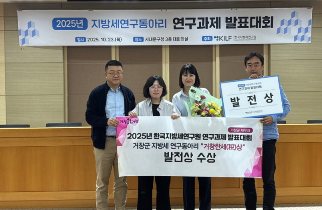 경남 거창군 지방세 연구동아리 '거창한세(稅)상'이 한국지방세연구원에서 주최한 '2025년 지방세 연구동아리 연구 공모 발표대회'에서 발전상을 수상하며 전국적인 성과를 거뒀다고 25일 밝혔다.