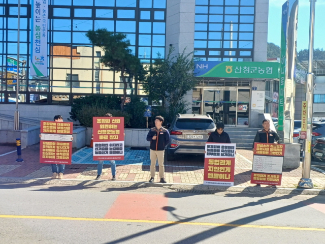 민주노총 전국사무금융서비스노동조합 부산울산경남본부(사무금융노조)는 27일 산청군농협 본점 앞에서 피켓시위를 열고 "조창호 산청군농협 조합장이 농협법상 경업 금지 조항을 위반했다"며 농협중앙회의 철저한 감사를 촉구했다.