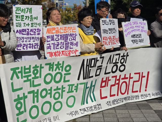 새만금신공항백지화공동행동과 '새만금싱공항 환경영향평가서 반려를 요청하는 국내외 전문가 그룹 134인'은 27일 전북지방환경청 앞에서 기자회견을 열고 새만금신공항 환경영향평가서를 즉각 반려하라고 촉구했다.
