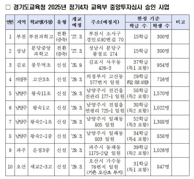 심사를 통과한 곳은 부천고와 분당중앙고 등 미래형 과학고 전환 2곳을 비롯해 3기 신도시 및 개발지구 내 신설 학교 8곳(김포 풍무역초, 남양주 왕숙11초, 남양주 왕숙1고, 남양주 왕숙2-1초, 남양주 왕숙2-1중, 오산 세교2-3고, 의정부 고산3초, 파주 운정3중)이다.