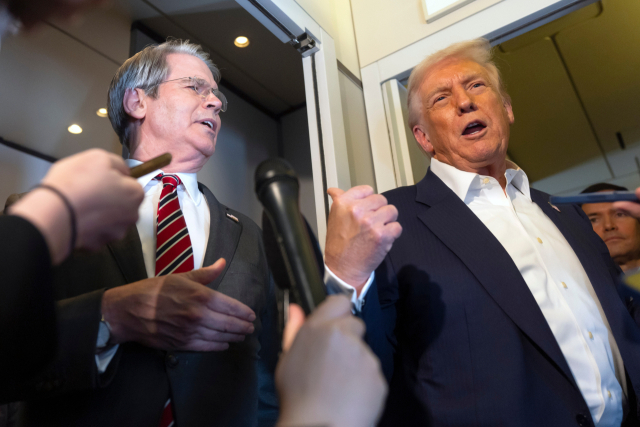 ▲ 27일(현지시간) 말레이시아 쿠알라룸푸르에서 일본 도쿄로 향하는 전용기(에어포스원)에서 도널드 트럼프 미국 대통령(오른쪽)이 스콧 베선트 미 재무장관을 가리키고 있다. ⓒAP=연합뉴스