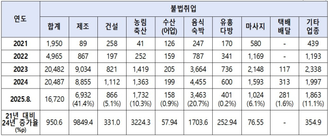 2025년 8월 기준 업종별 불법취업 적발 현황을 보면 △제조업이 6932건(41.4%)으로 가장 많았고, △음식·숙박업 3463건(20.7%) △농림축산업 1732건 (10.3%)이 뒤를 이었다. 특히 최근 2021년부터 2024년 사이 불법취업 적발 건수는 제조업에서 77배, 농림축산에서 33배로 가파르게 증가했다.