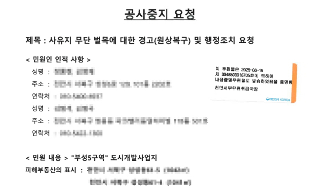 부성5구역 시행사 관계자는 “토지 경계를 착각해 무단 벌목을 한 사실은 인정한다. 토지주들에게 사과했고 보상도 할 계획이다. 하지만 토지 보상은 다른 문제다. 토지주와 원만한 합의가 이루어지길 바란다”고 말했다.
