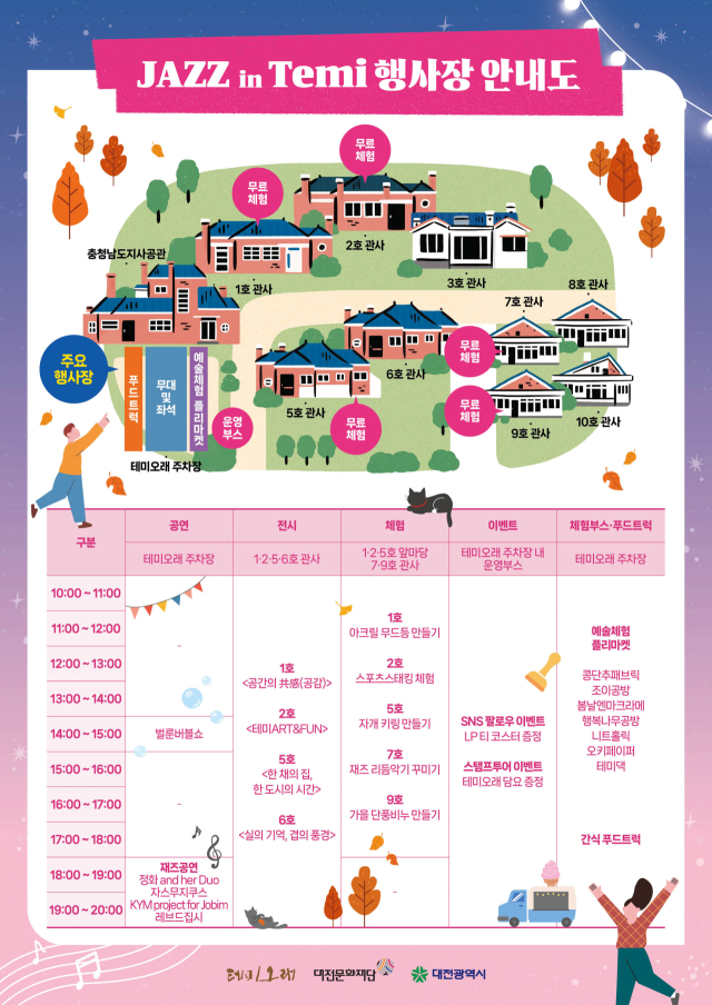 이번 축제는 가을 정취와 재즈 감성을 함께 즐길 수 있는 음악축제로 휴관 중인 충남도지사 공관 대신 테미오래 주차장이 축제장으로 개방된다.