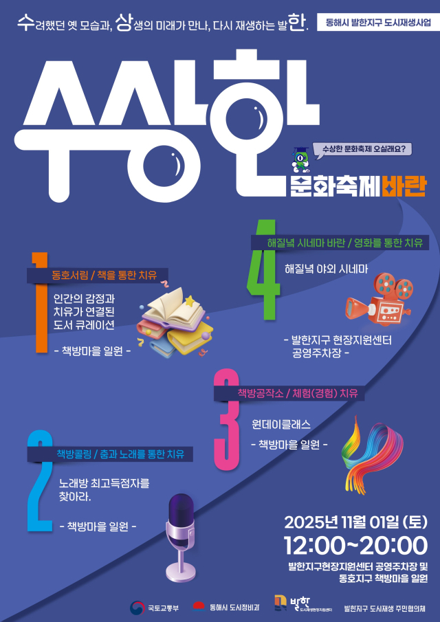 11월 1일 동호 책방마을과 발한지구 현장지원센터 공영주차장 일원에서 열리는 ‘수.상.한. 문화축제’는 묵호 지역의 과거와 현재, 미래를 연결하는 특별한 문화재생의 장을 선보인다.