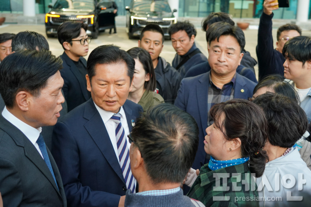 경선 과정에서 터져나온 당내 불협화음도 신임 시당위원장 앞에 놓인 숙제다. 유동철 위원장이 "APEC 기간에는 대응을 자제하겠다"며 한 발 물러섰지만 불씨가 남아있기 때문이다. 이날도 행사장 앞에서는 수영구지역위원회 당원들이 시위를 벌이고 있었다. 정청래 대표가 도착하자 이들은 정 대표를 둘러싸고 항의를 이어갔다.