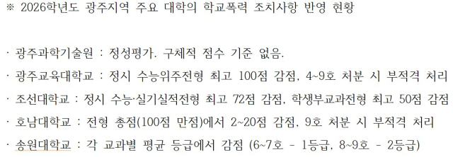 이 시민단체의 분석 결과 광주교육대학교는 정시 수능위주전형에서 학폭 이력으로 최고 100점을 감점하고, 4~9호 처분을 받은 학생은 아예 '부적격' 처리하는 등 가장 강력한 기준을 적용했다. 호남대학교 역시 9호(퇴학) 처분을 받으면 부적격 처리하고 사안에 따라 총점에서 220점을 감점한다.