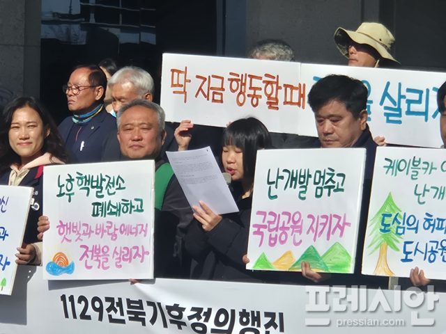 전북지역 60개 시민·사회단체로 구성된 ‘1129 전북기후정의행진 추진위원회’는 4일 오전 전북도청 앞에서 기자회견을 열고 “전북도정은 낡은 기득권 정치로 도민들의 열망을 짓밟지 말고 개발 허상을 중단하라”고 촉구했다.