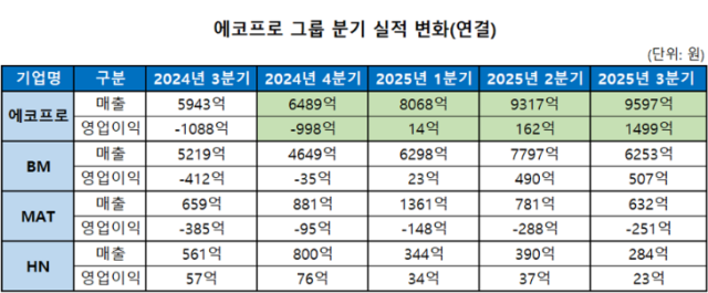 주요 계열사 가운데 에코프로비엠은 3분기 매출 6천253억 원, 영업이익 507억 원을 기록해 3개 분기 연속 흑자를 이어갔다.