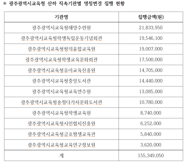 시민모임에 따르면 시교육청 산하 12개 직속기관은 올해 명칭 변경에 따라 간판, 표지석, 직인 등을 교체하는 데 총 1억 5000여만 원을 사용했다.