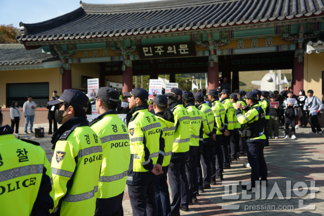 하지만 묘역 입구 '민주의 문'은 장 대표의 도착 전부터 광주전남촛불행동, 대학생진보연합, 소나무당, 국민주권당, 518민족통일학교 등 시민단체·정당 관계자 50여 명이 막아선 상태였다.