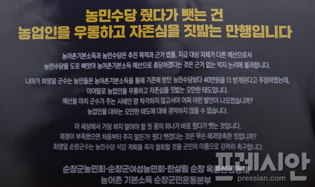 하지만 이번 시범사업 선정으로 군이 “농민에게 주던 군비 140만 원을 기본소득 재원으로 전환해 농민뿐 아니라 모든 군민이 혜택을 받을 수 있도록 하겠다"는 방침을 밝히자 순창군농민회가 “농민 몫을 깎아 군민 전체에 나누는 것"이라며 들고일어났다.