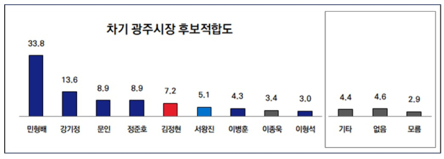 이어 강기정 시장 13.6%, 문인 광주 북구청장과 정준호 국회의원이 각각 8.9%, 김정현 국민의힘 광주시당위원장 7.2%로 조사됐다.