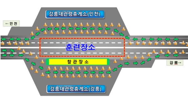 훈련 전일 오후 2~4시 및 훈련 당일 오전 9시~오후 5시까지 영동선 강릉 대관령휴게소 본선 구간 양방향 통행이 차단되고 차량은 강릉 대관령휴게소 광장부로 우회하여 통행할 수 있다.