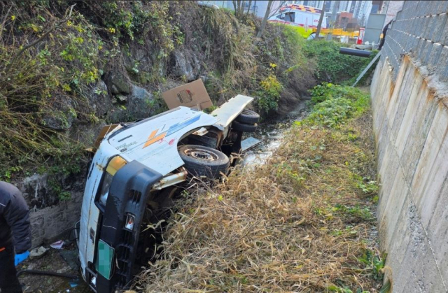 현장에 도착한 소방당국은 3m 아래 개울 바닥에서 전도된 트럭을 발견했다.