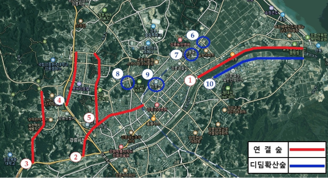 연결숲(15.4㎞)은 강릉대로 등 5곳 도심가로변에 관목과 교목을 복층으로 식재한 녹지대를 신규로 조성하여 녹시율을 높이는 숲이다.