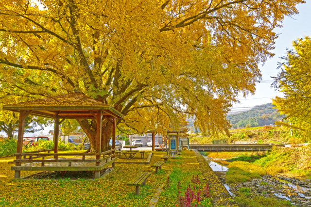11월 황금빛으로 물든 나무 아래 정자와 쉼터는 가을의 여유를 만끽하기 좋은 명소다.