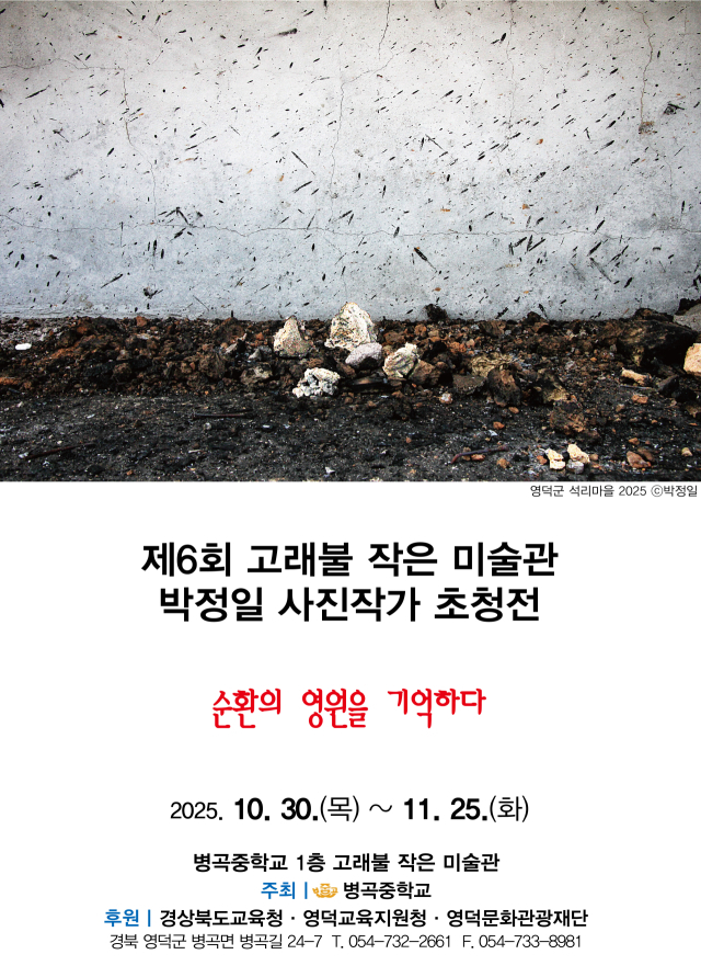 영덕 병곡중학교 내 고래불 작은 미술관에서 경상북도교육청의 문화예술체험비 지원사업으로 지난달 30일부터 이달 25일까지 제6회 고래불 작은 미술관 박정일 사진작가 초청전 ‘순환의 영원을 기억하다’전이 열리고 있다.