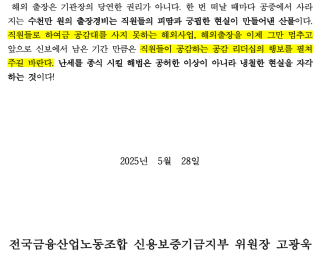 신보 노조는 이미 지난 5월 성명서를 통해 최 이사장의 잦은 해외출장을 문제 삼으며 “출장 보고서가 형식적이고 실질적 성과가 확인되지 않는다”고 비판한 바 있다.