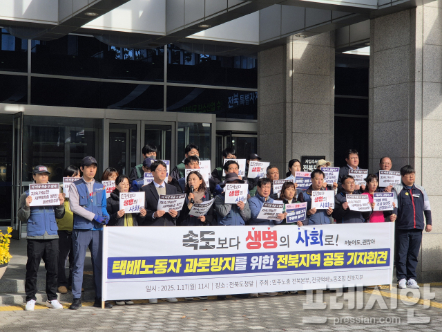 민주노총 전국택배노동조합 전북지부는 17일 오전 전북도청 앞에서 기자회견을 열고 "지난 9월 말 '속도보다 생명을' 사회적 대화 기구를 발족해 심야배송 규제와 365일 배송에 따른 노동자 건강권 보호 방안 마련 논의를 하고 있지만 최근 다른 방향으로 해석되고 있다"고 말했다.