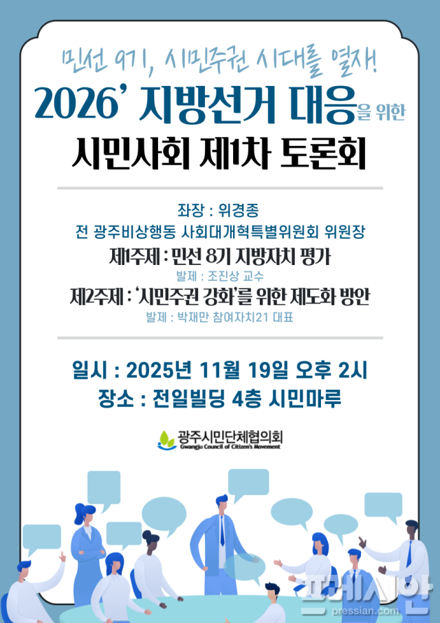 광주 27개 시민사회단체 연대기구인 광주시민단체협의회는 오는 19일 오후 2시 전일빌딩245 시민마루에서 '2026 지방선거 대응 시민사회 1차 토론회'를 개최한다고 18일 밝혔다.