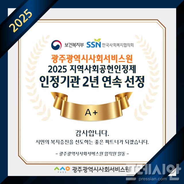 광주사회서비스원은 2024년에 이어 올해에도 지역사회공헌 인정제 인정기관에 도전하여 성과를 인정받아 2년 연속 선정(A+) 선정됐다.