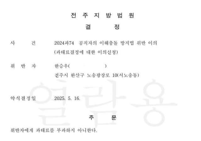한승우 의원은 자신의 배우자가 근무하는 기관에 수억 원 예산을 몰아줬다는 의혹과 관련해 이해충돌방지법 위반 혐의로 고발됐으나 해당 기관이 전주시 위탁기관이 아니고 시로부터 추가 예산을 받은 사실도 없는 것으로 확인됐다.