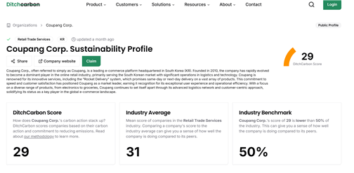 Ditch Carbon은 쿠팡의 업종(소매유통업)이 산업 평균 기준으로는 탄소집약도가 낮은 편이라고 평가하지만, 이것이 쿠팡의 실제 배출 규모나 증가 추세를 설명하지는 못한다. 배출은 급증하는데, 배출이 어디서 얼마나 발생하는지는 정확하게 알 길이 없다. '친환경 포장'과 '전기차 배송센터 확대'라는 홍보 문구와 달리 기후 책임의 기반인 데이터 공개와 검증 가능성이 부재한 것이다.