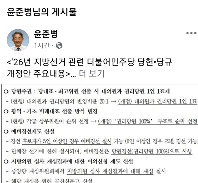 윤준병 민주당 전북도당위원장은 22일 페이스북에 올린 글에서 "2026년 지방선거 관련 더불어민주당 당헌·당규 개정안이 전날 민주당 최고위에서 의결됐다"며 주요 내용을 공개했다.