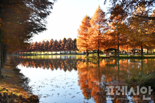 가로수 인근의 수면에는 나무와 단풍의 색감이 고스란히 반사돼 한층 더 깊은 가을 정취를 연출하고 있다.