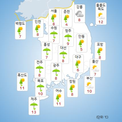 이날 낮 최고기온은 대전·천안 10도, 세종·청주 11도로 예상되며 최저기온은 6~9도 수준이다.