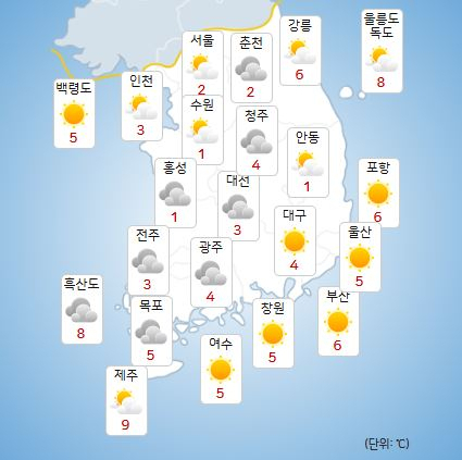 이날 낮 최고기온은 대전 10도, 세종·천안 11도, 청주 12도로 예보됐으며 최저기온은 0~4도 수준으로 떨어질 전망이다.