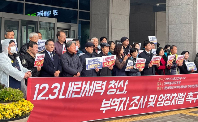 전북개헌운동본부는 27일 오전 전북도청 앞에서 기자회견을 열고 “윤석열의 위헌적 계엄 조치에 전북도와 14개 시·군 단체장들이 적극 협조했다”며 “도청 및 시·군 청사 폐쇄는 내란 부화수행 행위”라고 주장했다.