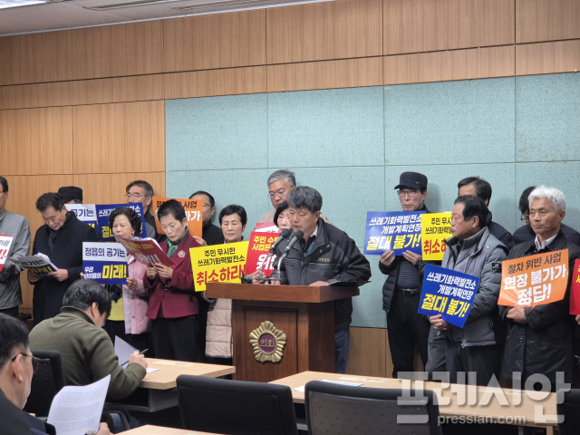 폐목재화력발전소 정읍시반대대책위원회 등은 27일 오전 전북도의회 브리핑룸에서 기자회견을 열고 "정읍시민의 건강권을 침해하고 안전을 위협하는 폐목재 쓰레기 화력발전소 사업기간 연장신청을 불허하라"고 촉구했다.