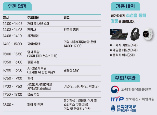 또한 ‘지역상생 오픈토크’에는 전북 IT기업과 지자체, 대학(학생)이 함께 참여한다. 지역 일자리와 주거 문제, 청년 지원 정책, 기업의 실제 채용 수요 등을 논의하며, 청년 인재 유출 문제를 줄이고 지역 정착을 위한 현실적 대안을 모색하는 소통 프로그램이다.