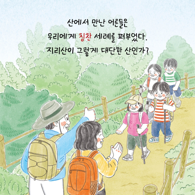 "저에게도 지리산은 단순한 산이 아니에요. 나를 위로해 주고, 진짜 나를 만나게 해 주는 상냥하고 따뜻한 친구랍니다. 이 글을 읽는 어린이 여러분도 언젠가 지리산을 걸으며 그 상냥함과 위로, 즐거움을 느껴 보았으면 좋겠어요. 지리산은 분명, 여러분에게도 멋진 선물이 되어 줄 거예요"