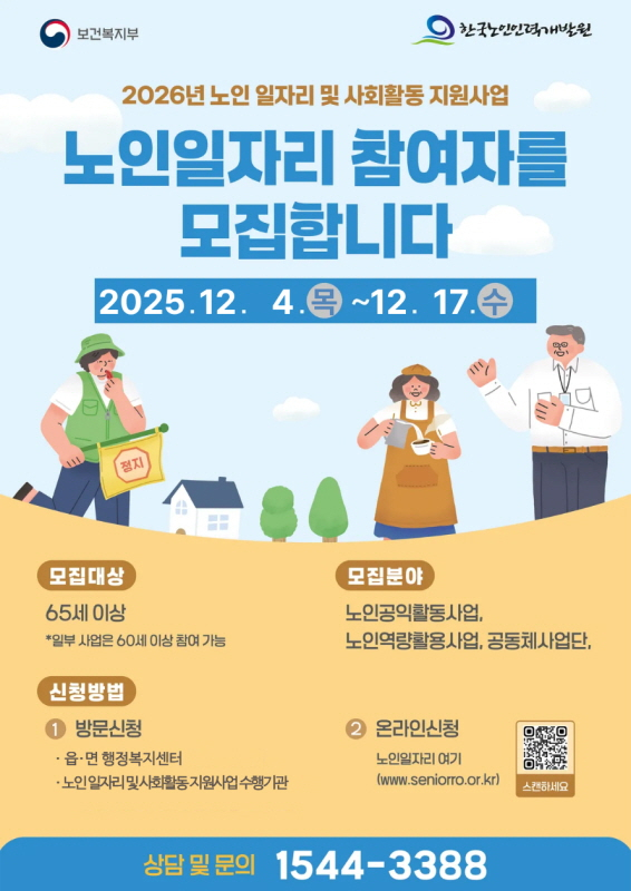 경남 거창군은 오는 4일부터 17일까지 '2026년 노인일자리와 사회활동지원사업' 참여자를 모집한다. 모집 규모는 3개 분야 48개 사업 총 2635명으로 올해보다 266명 증가해 더 많은 어르신에게 일자리 참여 기회가 제공될 전망이다.