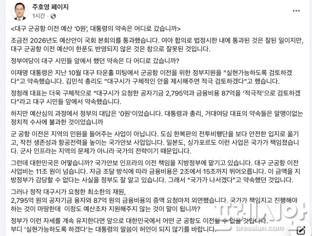 반면 대구지역 다른 의원들은 신공항 예산 누락에 대해 별도 입장을 내지 않았다. 일부 의원들은 민주당을 향한 규탄 논평, 특검이 청구한 추경호 의원(달성군) 구속영장 비판 등 정치공세성 메시지에 집중해 지역 현안과 온도 차가 두드러진다는 지적이 나온다.